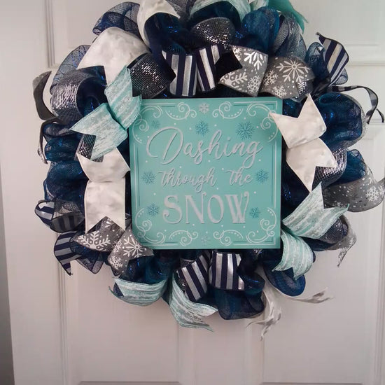 Dashing through the Snow Wreath - Winter Christmas Mesh Front Door Wreath - White Blue Grey