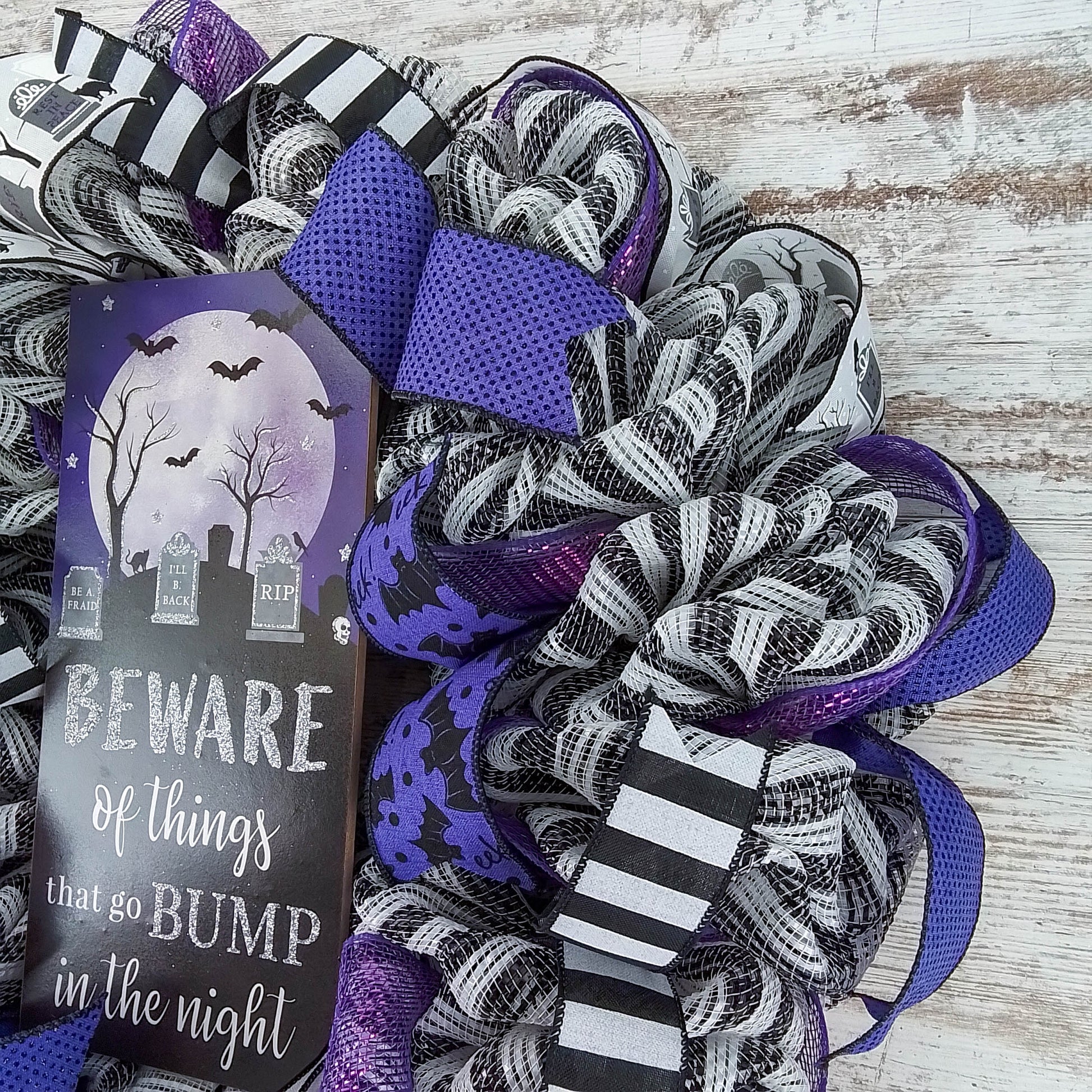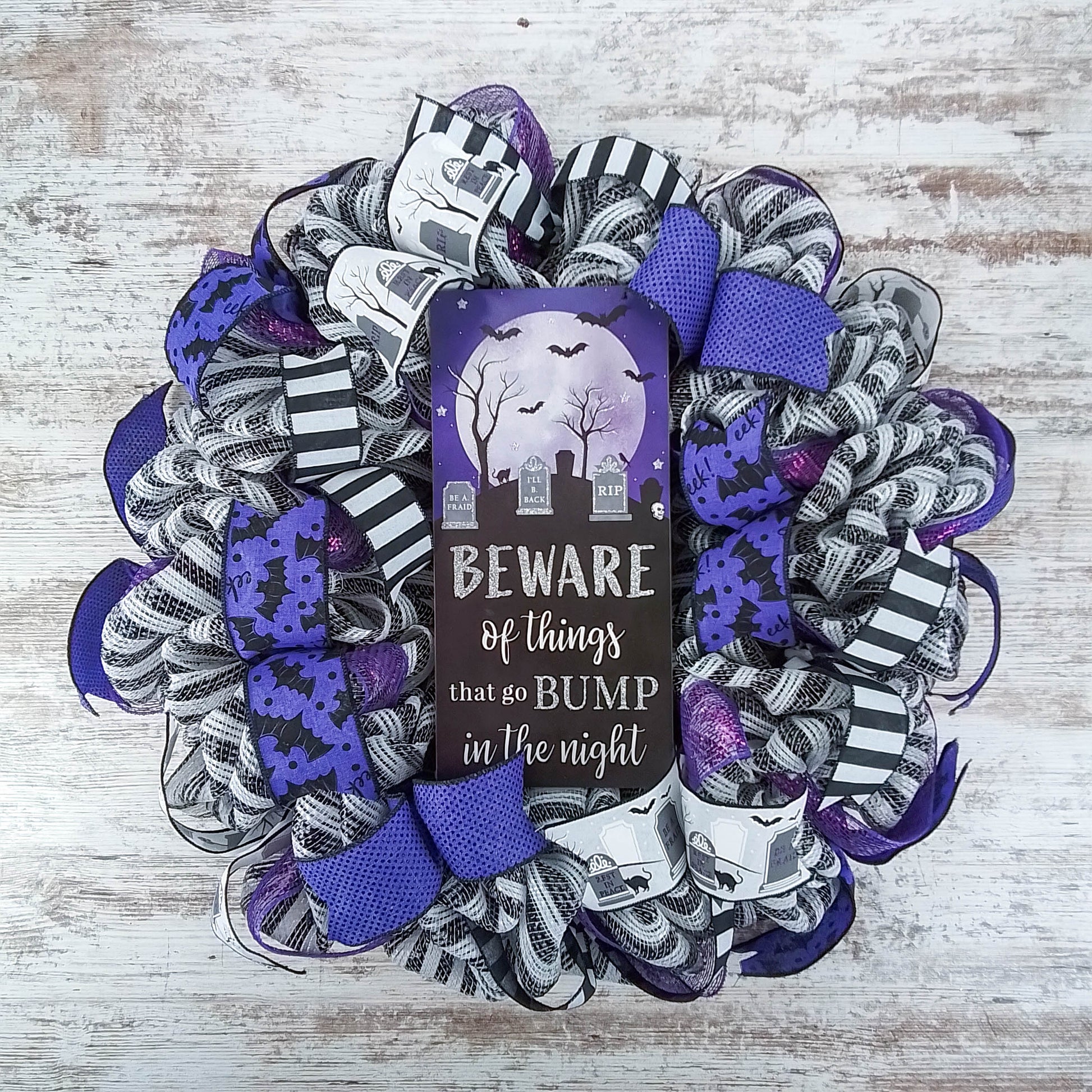 Beware of Things that go Bump in the Night Halloween Wreath, Seasonal Home Decor, Festive Party Accent Purple Black White