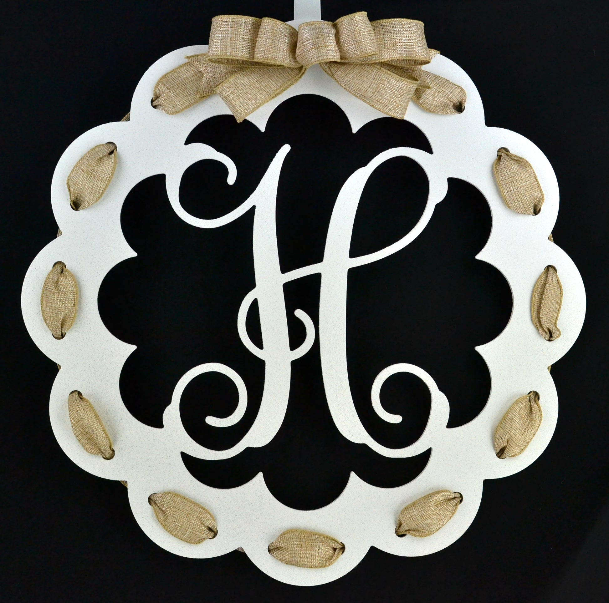 Letter H : White and Burlap Scalloped Monogram door hanger