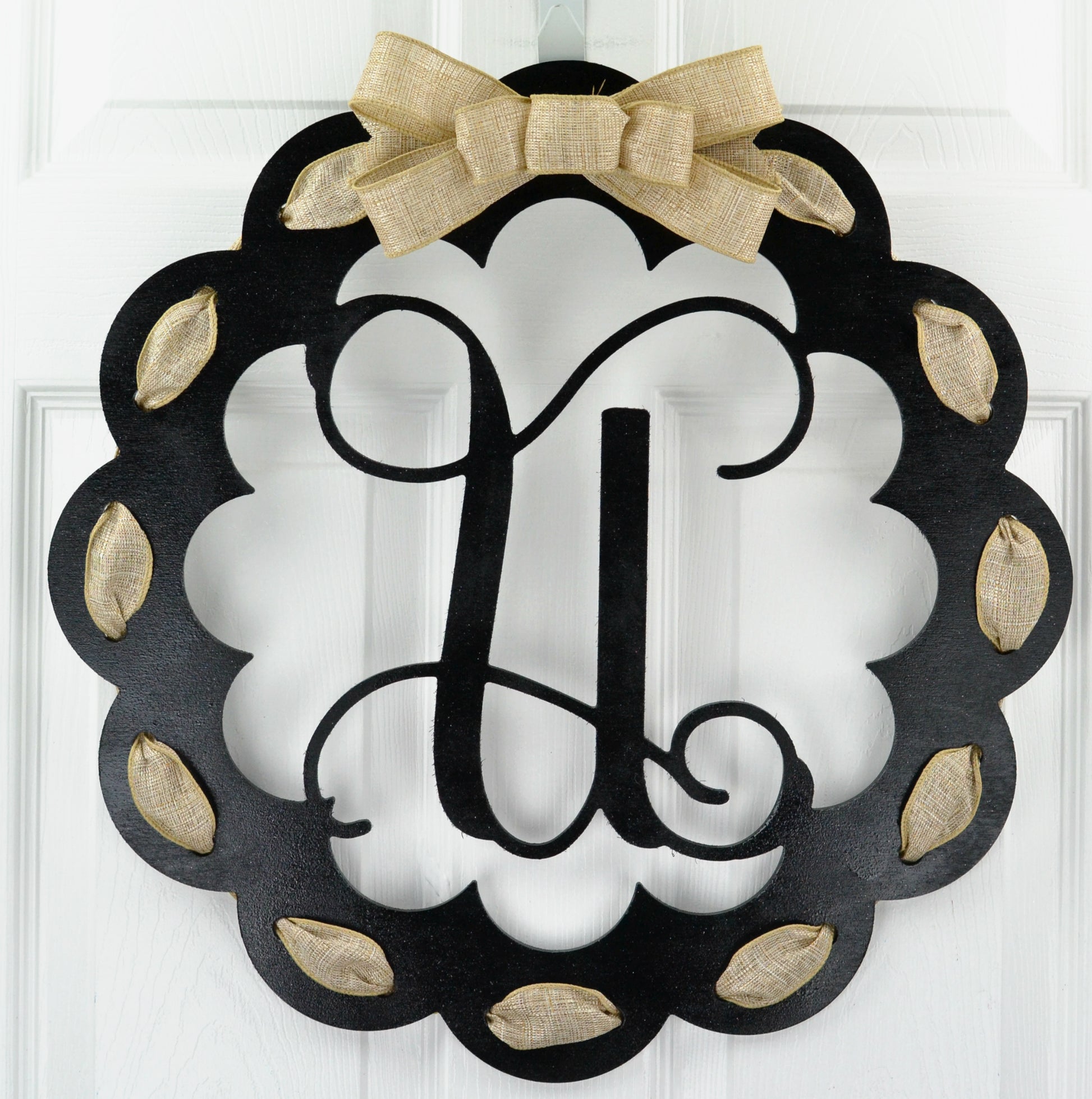 Letter U : Black and Burlap Scalloped Monogram door hanger