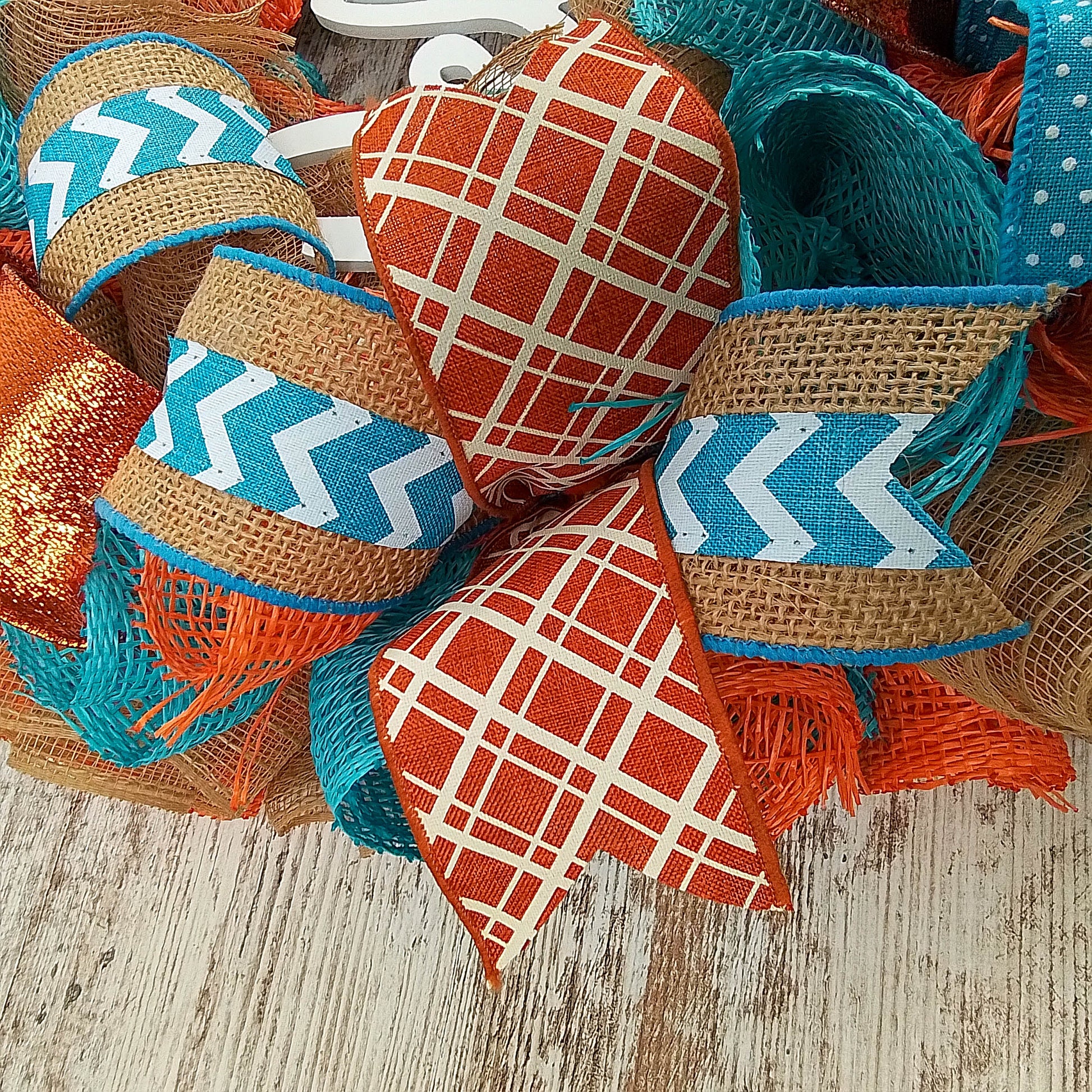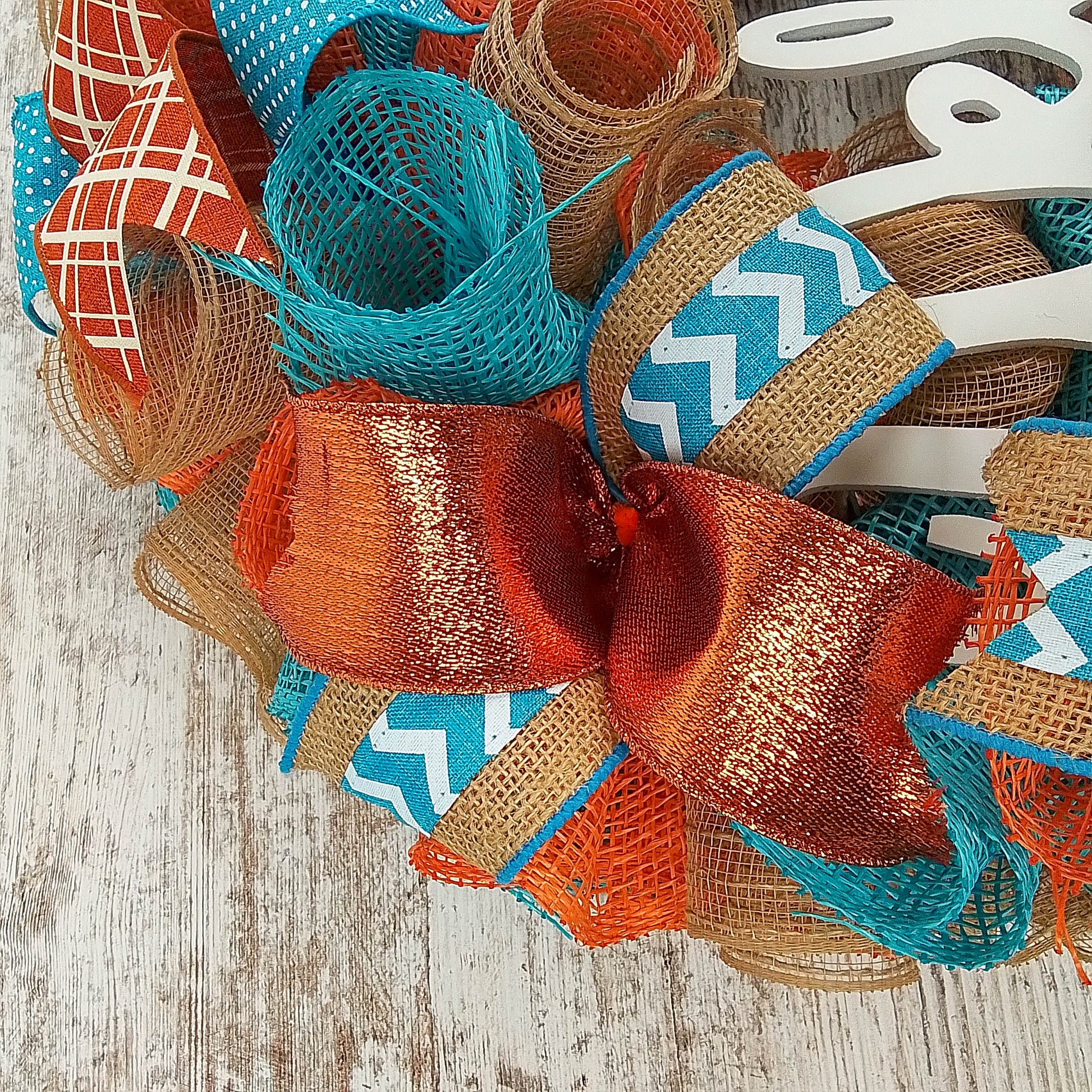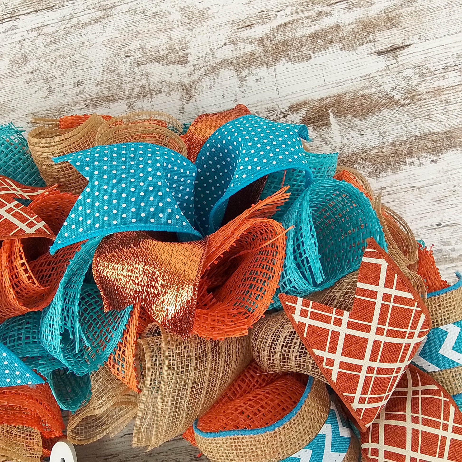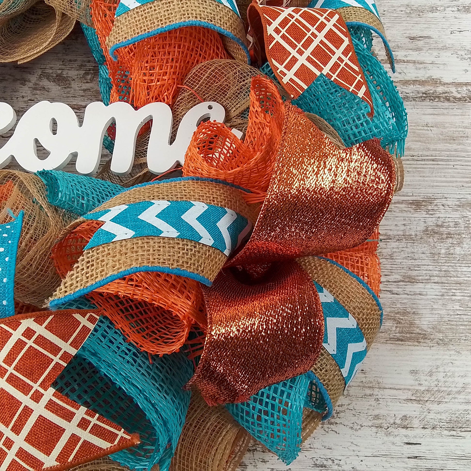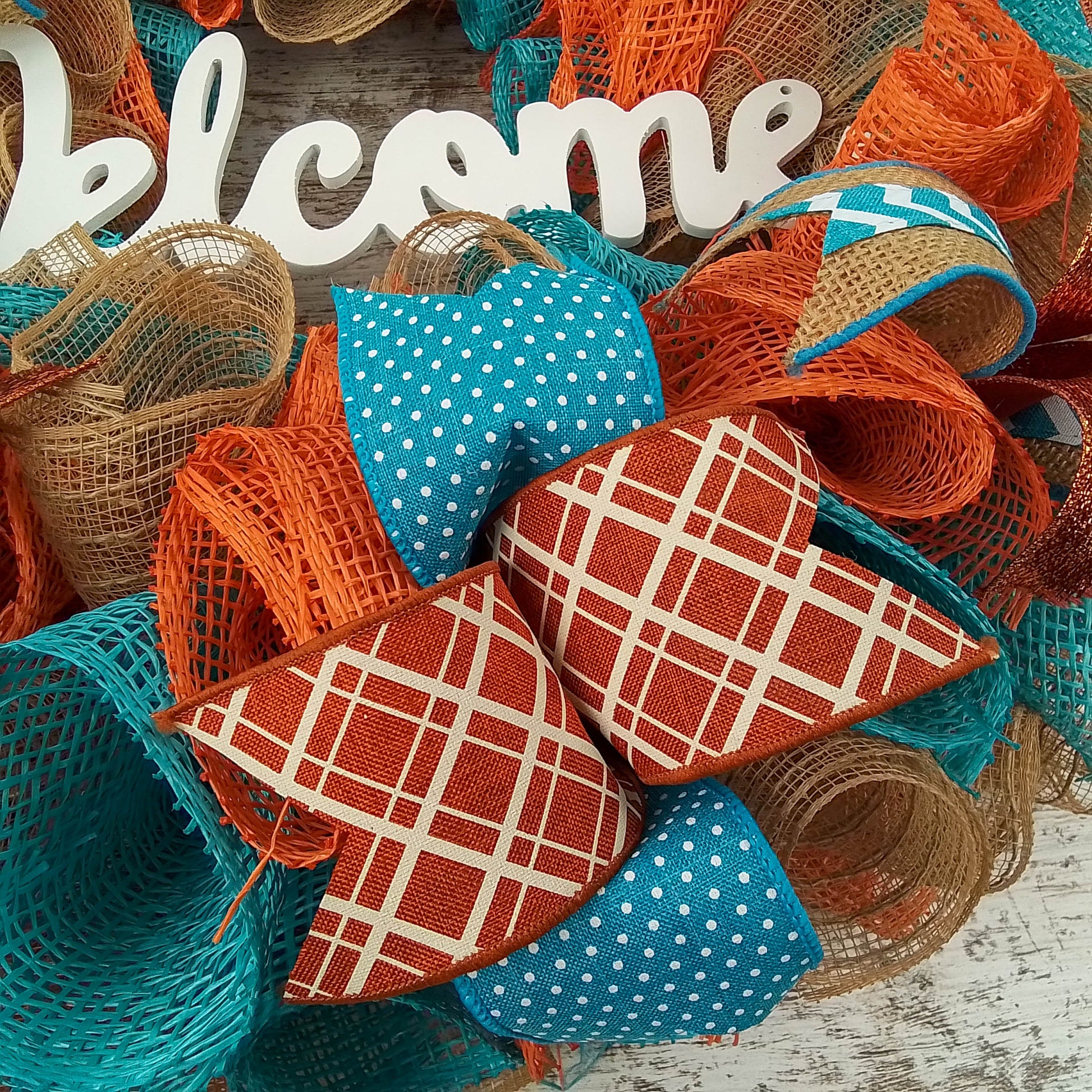 This Orange and Turquoise Fall Welcome wreath will make a wonderful addition to your indoor or outdoor home decor or a thoughtful gift for that special person or a special occasion. Use it for your Fall decor or it would make a perfect housewarming gift.